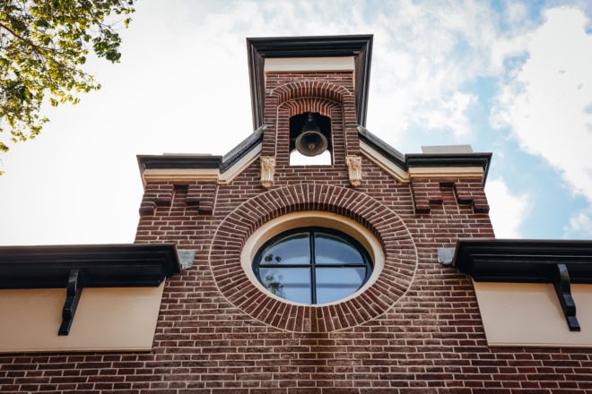 Het gevelmetselwerk is met hergebruik van bestaande bakstenen gerestaureerd.